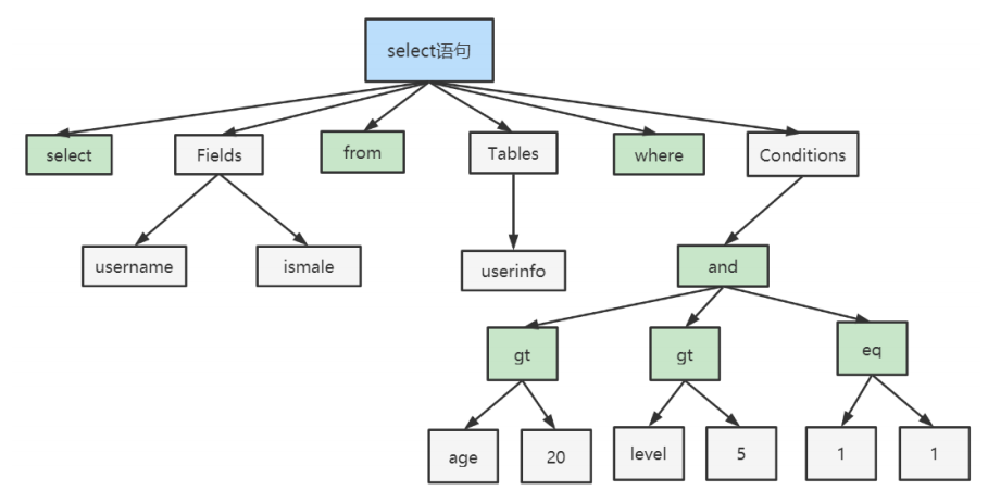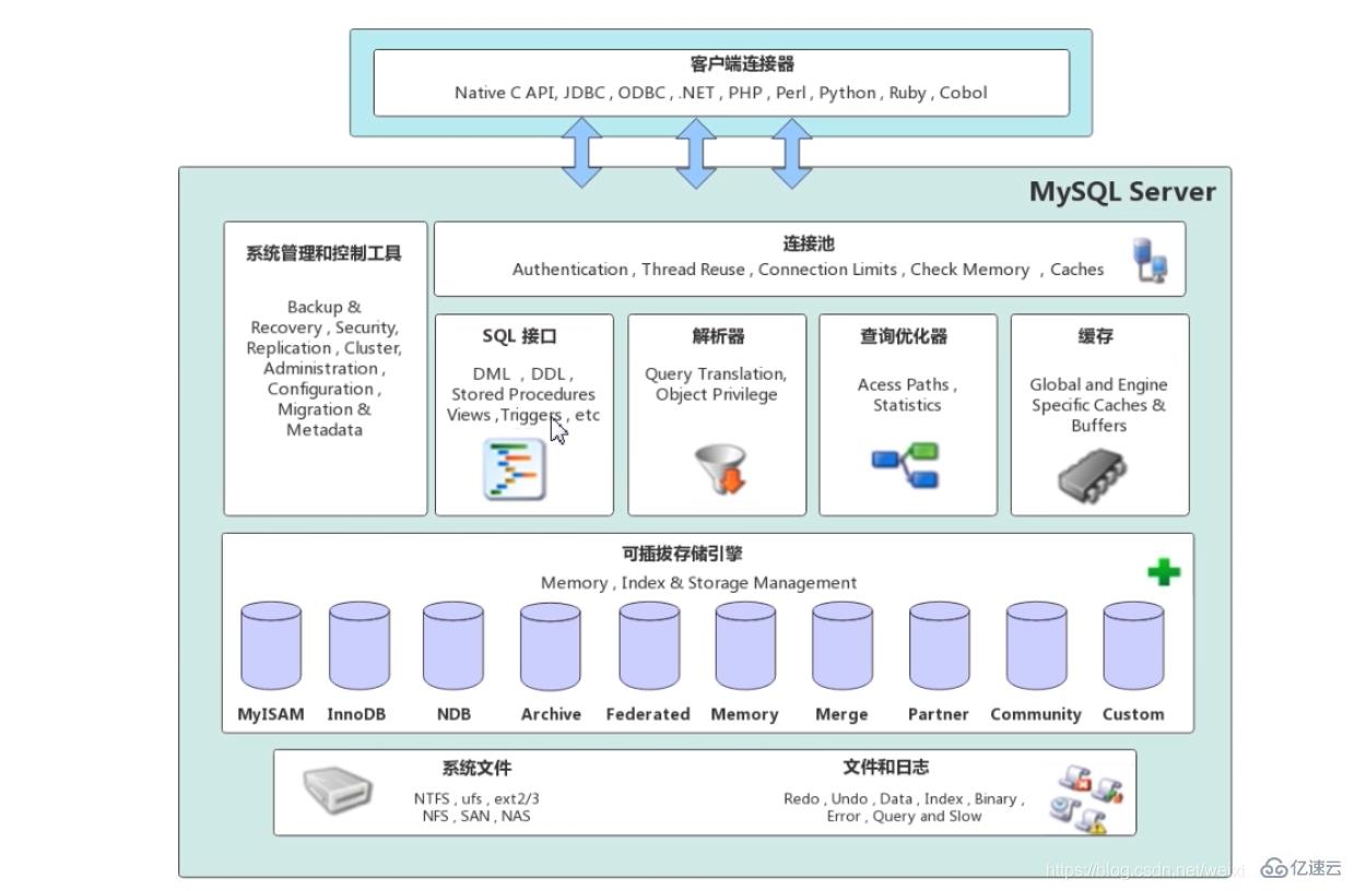 和其它数据库相比,MySQL有点与众不同,它的架构可以在多种不同场景中应用,并发挥良好作用。<font color='red'>主要体现在存储引擎的架构上,插件式的存储引擎架构将查询处理和其它的系统任务以及数据的存储提取相分离。</font>这种架构可以根据业务的需求和实际需要选择合适的存储引擎。  ## 连接层 最上层是一些客户端和连接服务,包含本地socket通信和大多数基于客户端/服务 端工具实现的类似于tcp/ip的通信。主要完成一些类似于连接处理、授权认证、及相关的安全方案。在该层上引入了线程池的概念,为通过认证安全接入的客户端提供线程。同样在该层上可以实现基于SSL的安全链接。服务器也会为安全接入的每个客户端验证它所具有的操作权限。 ## 服务层 1. Management Serveices & Utilities: 系统管理和控制工具 2. SQL Interface:SQL接口。接受用户的SQL命令(包括DDL和DML指令)并返回执行结果。比如select from就是调用SQL Interface。 3. Parser: 解析器,将客户端发送的SQL进行语法和语义解析,生成“解析树”。SQL命令传递到解析器的时候会被解析器验证和解析。预处理器根据一些MySQL规则进一步检查“解析树”是否合法,例如这里将检查数据表和数据列是否存在,还会解析名字和别名,看看它们是否有歧义,最后生成新的“解析树”。  4. Optimizer: 查询优化器 * 语法树没有问题后,**优化器将其转成执行计划,并选择最有效的执行计划**。优化器是决定查询性能的关键组件,而数据库的统计信息是优化器判断的基础。 * 这个执行计划表明应该**使用哪些索引**进行查询(全表检索还是使用索引检索),表之间的连接顺序如何,最后会按照执行计划中的步骤调用存储引擎提供的方法来执行查询,并将查询结果返回给用户。 * 执行一个查询时,它使用“选取-投影-连接”策略进行查询。例如: select uid,name from user where gender= 1; 这个select 查询先根据where 语句进行**选取**,而不是先将表全部查询出来以后再进行gender过虑 这个select查询先根据uid和name进行属性**投影**,而不是将属性全部取出以后再进行过滤 将这两个查询条件**连接**起来生成最终查询结果。 **注意:mysql的优化器是基于查询成本的优化,不是基于查询时间的优化。** 5. Cache和Buffer: 查询缓存组件。 如果查询缓存有命中的查询结果,查询语句就可以直接去查询缓存中取数据。它存储SELECT语句以及相应的查询结果集。 这个缓存机制是由一系列小缓存组成的。比如表缓存,记录缓存,key缓存,权限缓存等 这个查询缓存可以在 不同客户端之间共享 。 从MySQL 5.7.20开始,不推荐使用查询缓存,并在 MySQL 8.0中删除 。 ## 引擎层 存储引擎层,**存储引擎真正的负责了MySQL中数据的存储和提取**,服务器通过API与存储引擎进行通信。不同的存储引擎具有的功能不同,这样我们可以根据自己的实际需要进行选取。后面介绍MyISAM和InnoDB ## 存储层 所有的数据,数据库、表的定义,表的每一行的内容,索引,都是存在 文件系统 上,以 文件 的方式存 在的,并完成与存储引擎的交互。当然有些存储引擎比如InnoDB,也支持不使用文件系统直接管理裸设 备,但现代文件系统的实现使得这样做没有必要了。