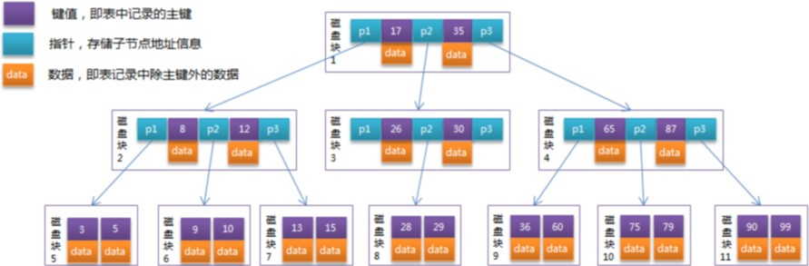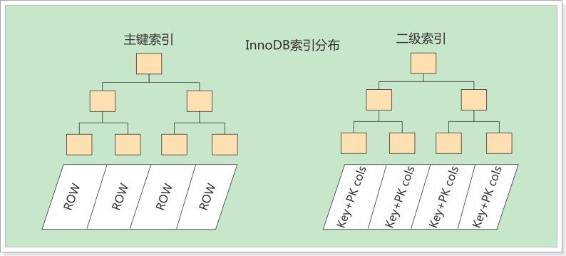 ## 简介 影响性能、SQL慢体现在:执行时间长或者等待时间长 影响sql性能的常见情况: - 数据过多:分库分表 - 关联了太多的表,太多join:SQL优化 - 没有充分利用到索引:索引建立 - 服务器调优及各个参数设置:调整my.cnf MySQL官方对索引的定义为:索引(Index)是帮助MySQL高效获取数据的数据结构。 可以得到索引的本质:<font color='red'>索引是数据结构。</font> 索引的目的在于<font color='red'>提高查询效率</font>,可以类比字典。 **结论**: **数据本身之外,数据库还维护着一个满足特定查找算法的数据结构,这些数据结构以某种方式指向数据,这样就可以在这些数据结构的基础上实现高级查找算法,这种数据结构就是索引。** ## 索引的优劣势 **优势**: 1. 类似大学图书馆建书目索引,<font color='red'>提高数据检索的效率</font>,降低数据库的IO成本。 2. 通过索引列对数据进行排序,<font color='red'>降低数据排序和分组的成本</font>,降低了CPU的消耗。 3. 加速表和表之间的连接,对于有依赖关系的子表和父表联合查询时,可以提高查询速度。 **劣势**: 1. 虽然索引大大提高了查询速度,同时却会<font color='red'>降低更新表的速度</font>,如对表进行INSERT、UPDATE和DELETE。因为更新表时,MySQL不仅要保存数据,还要保存一下索引文件。每次更新添加了索引列的字段,都会调整因为更新所带来的键值变化后的索引信息 2. 实际上索引也是一张表,该表保存了主键与索引字段,并指向实体表的记录,所以<font color='red'>索引列也是要占用空间的</font> ## MySQL的索引结构 ### BTree索引  **初始化介绍** 一颗b树,包含多个磁盘块,可以看到每个磁盘块包含几个键值(表中记录的主键)、数据(表中除主键外的数据)和指针(指向下一个磁盘块的指针)如磁盘块1包含键值17和35,包含指针P1、P2、P3,P1表示小于17的磁盘块,P2表示在17和35之间的磁盘块,P3表示大于35的磁盘块。真实的数据存在于叶子节点即3、5、9、10、13、15、28、29、36、60、75、79、90、99。非叶子节点不存储真实的数据,只存储指引搜索方向的键值信息,如17、35并不真实存在于数据表中。 **查找过程** 如果要查找数据项29,那么首先会把磁盘块1由磁盘加载到内存,此时发生一次IO,在内存中用二分查找确定29在17和35之间,锁定磁盘块1的P2指针,内存时间因为非常短(相比磁盘的IO)可以忽略不计,通过磁盘块1的P2指针的磁盘地址把磁盘块3由磁盘加载到内存,发生第二次IO,29在26和30之间,锁定磁盘块3的P2指针,通过指针加载磁盘块8到内存,发生第三次IO,同时内存中做二分查找找到29,结束查询,总计三次IO。 真实的情况是,3层的b+树可以表示上百万的数据,如果上百万的数据查找只需要三次IO,性能提高将是巨大的,如果没有索引,每个数据项都要发生一次IO,那么总共需要百万次的IO,显然成本非常非常高。 ### B+Tree索引  通常在B+Tree上有两个头指针,一个指向根节点,另一个指向关键字最小的叶子节点,而且所有叶子节点(即数据节点)之间是一种链式环结构。因此可以对B+Tree进行两种查找运算:一种是对于主键的范围查找和分页查找,另一种是从根节点开始,进行随机查找。通常在B+Tree上有两个头指针,一个指向根节点,另一个指向关键字最小的叶子节点,而且所有叶子节点(即数据节点)之间是一种链式环结构。因此可以对B+Tree进行两种查找运算:一种是对于主键的范围查找和分页查找,另一种是从根节点开始,进行随机查找。 ### B+Tree与B-Tree 的区别 1)B-树的关键字和记录是放在一起的,叶子节点可以看作外部节点,不包含任何信息;<font color='red'>B+树的非叶子节点中只有关键字和指向下一个节点的索引,记录只放在叶子节点中。</font> 2)在B-树中,越靠近根节点的记录查找时间越快,只要找到关键字即可确定记录的存在;而B+树中每个记录的查找时间基本是一样的,都需要从根节点走到叶子节点,而且在叶子节点中还要再比较关键字。从这个角度看B-树的性能好像要比B+树好,而在实际应用中却是B+树的性能要好些。因为B+树的非叶子节点不存放实际的数据,这样每个节点可容纳的元素个数比B-树多,树高比B-树小,这样带来的好处是减少磁盘访问次数。尽管B+树找到一个记录所需的比较次数要比B-树多,但是一次磁盘访问的时间相当于成百上千次内存比较的时间,因此实际中B+树的性能可能还会好些,而且B+树的叶子节点使用指针连接在一起,方便顺序遍历(例如查看一个目录下的所有文件,一个表中的所有记录等),这也是很多数据库和文件系统使用B+树的缘故。 ### 为什么说B+树比B-树更适合实际应用中操作系统的文件索引和数据库索引? **B+树的磁盘读写代价更低** B+树每个盘块所能容纳的关键字数量也越多。一次性读入内存中的需要查找的关键字也就越多。相对来说IO读写次数也就降低了。 **B+树的查询效率更加稳定** 由于非叶子节点只包含键值和下一节点的指针,只有叶子节点才有具体数据项。所以任何关键字的查找必须走一条从根节点到叶子节点的路。所有关键字查询的路径长度相同,导致每一个数据的查询效率相当。 ## 聚簇索引与非聚簇索引 **聚簇索引**:将数据存储与索引放到了一块,找到索引也就找到了数据 **非聚簇索引**:非聚集索引又叫辅助索引,叶子节点并不包含行记录数据,而是存储了聚集索引键。辅助索引访问数据总是需要二次查找(**回表**),每个表可以有多个辅助索引。  InnoDB